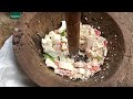 - Haluskan Bumbu: Ulek cabai rawit dan garam hingga halus di cobek. Masukkan terasi (jika pakai) dan gula merah, ulek kembali hingga tercampur rata dan gula merah larut. Tambahkan kacang tanah goreng (jika pakai) dan air asam jawa, aduk hingga menjadi pasta bumbu yang kental.